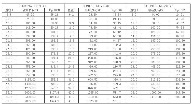 2、破斷負(fù)荷為纖維芯FC鋼絲破斷拉力總和,金屬芯IWR鋼絲破斷拉力總和≈纖維芯的1.08倍,鋼絲破斷拉力總和=鋼絲繩最小破斷拉力X1.283。
